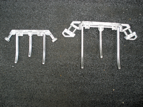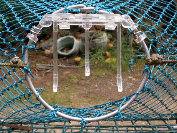 The specific shape of the gate is the result of 19 prototypes before an effective gate was produced. The length of the tines in relation to the shape of the hoop gives the appearance of a hole through which the lobster will enter. The curved tines allow the gate to ride up on the lobster's back without spooking the lobster. The key to having the gate work effectively is the shape of the tines and the gate's sensitivity when a lobster comes in contact with it.